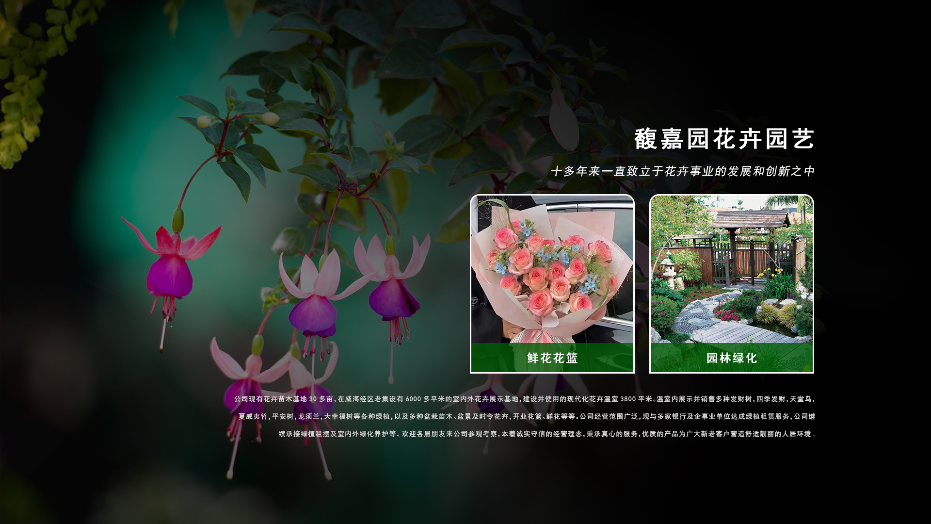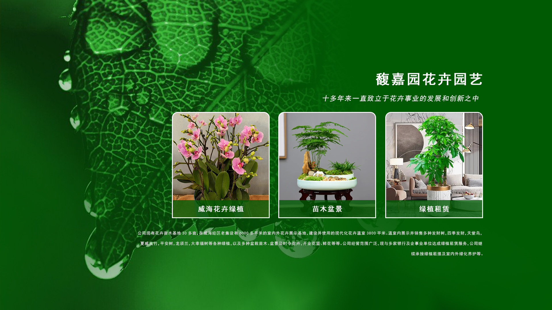 威海市馥嘉園花卉園藝有限公司成立于2009年,十多年來一直致立于花卉事業(yè)的發(fā)展和創(chuàng)新之中。公司現(xiàn)有花卉苗木基地30多畝,在威海經(jīng)區(qū)老集設有6000多平米的室內(nèi)外花卉展示基地,建設并使用的現(xiàn)代化花卉溫室3800平米。溫室內(nèi)展示并銷售多種發(fā)財樹,四季發(fā)財,天堂鳥,夏威夷竹,平安樹,龍須蘭,大幸福樹等各種綠植,以及多種盆栽苗木、盆景及時令花卉,開業(yè)花籃、鮮花等等。公司經(jīng)營范圍廣泛,現(xiàn)與多家銀行及企事業(yè)單位達成綠植租賃服務,公司繼續(xù)承接綠植租擺及室內(nèi)外綠化養(yǎng)護等。