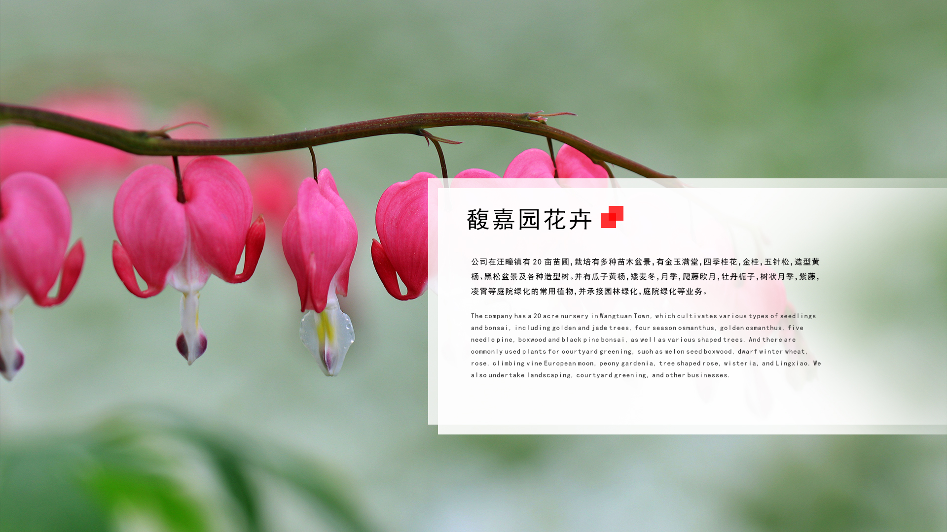 公司在汪疃鎮(zhèn)有20畝苗圃,栽培有多種苗木盆景,有金玉滿堂,四季桂花,金桂,五針松,造型黃楊、黑松盆景及各種造型樹。并有瓜子黃楊,矮麥冬,月季,爬藤歐月,牡丹梔子,樹狀月季,紫藤,凌霄等庭院綠化的常用植物,并承接園林綠化,庭院綠化等業(yè)務